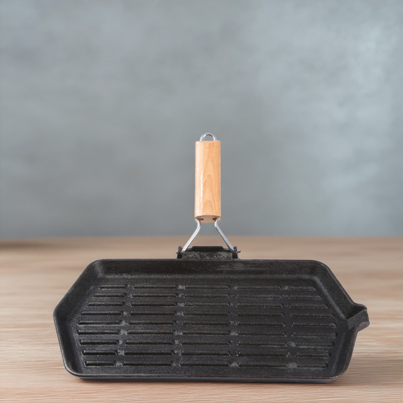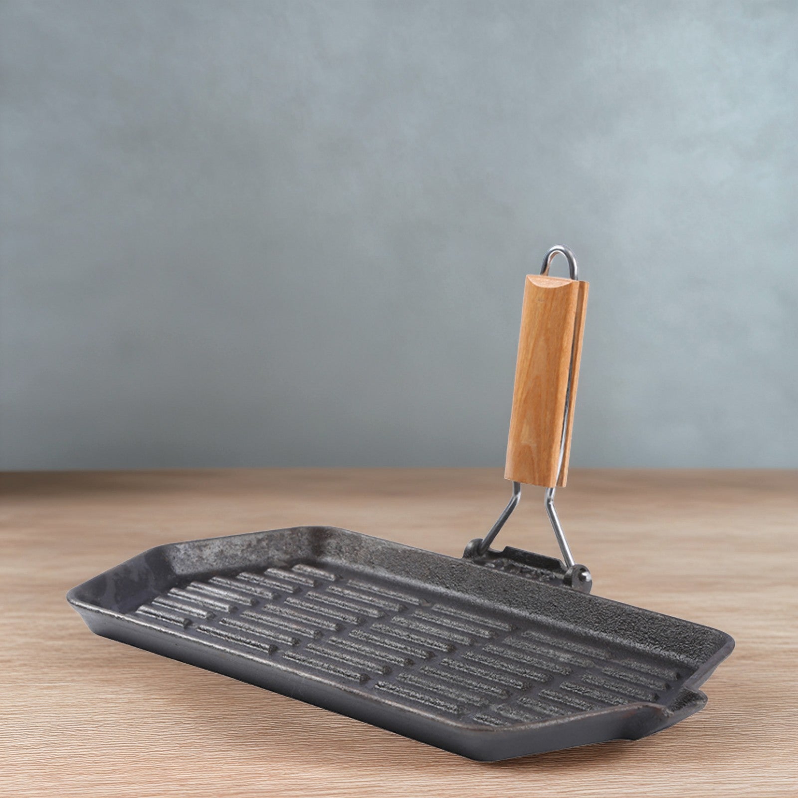1x Foldable Handle Cast Iron Frying Pan (21x35cm) - Ridged Bottom, Solid Wood Grip, Multi-Stove Friendly, Heavy-Duty Cookware for Steak/Pancake/Home Meals